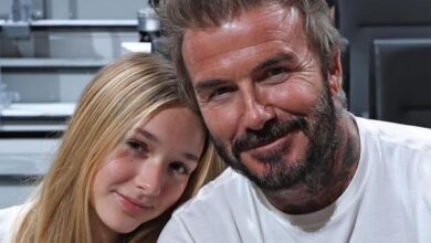 David Beckham shares sweet photo of teen daughter Harper sitting on his knee in behind-the-scenes moment.