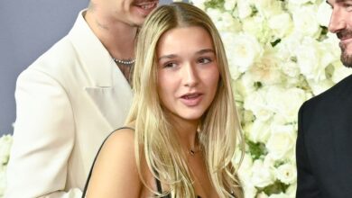 Harper Beckham steps out in satin and feathers at Holly Ramsay’s winter wedding.