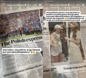 “Przejrzałam na lotnisku wszystkie gazety i Brytyjczyków interesuje najbardziej księżna. Jak wyglądała, co mówiła, jak reagowała. Na żadnej okładce nie ma Igi. Za to Kate była na dwóch czy trzech” – przekazała na Insta Stories.